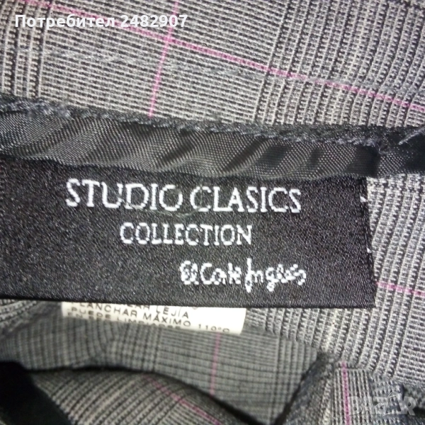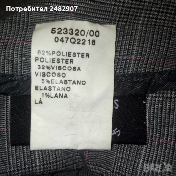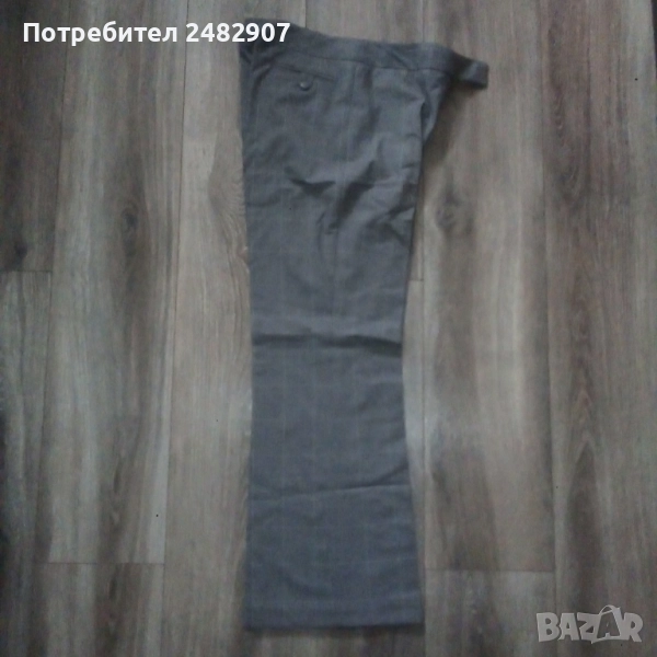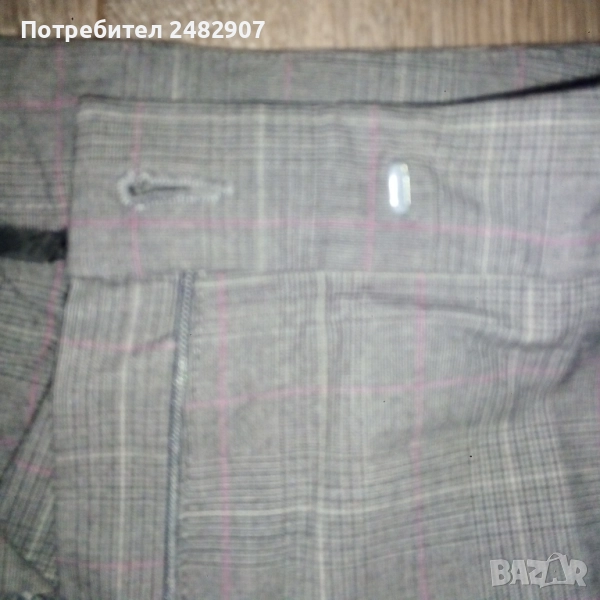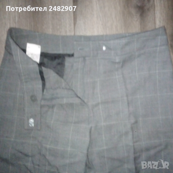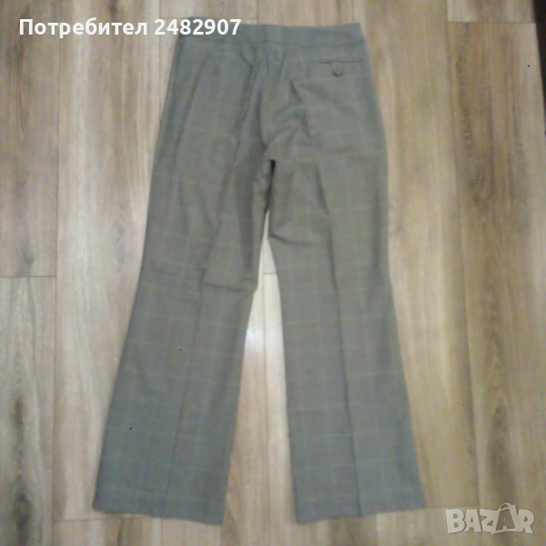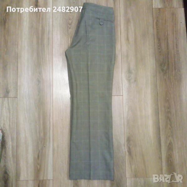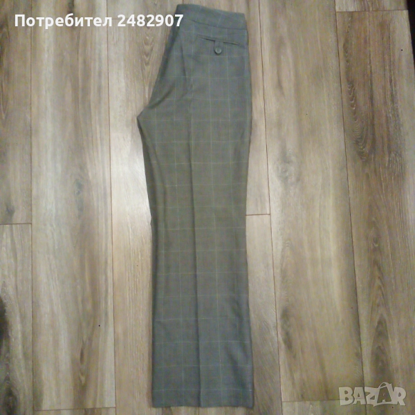 Кариран дамски панталон в сиво, размер 38. Съдържа 62 % полиестер, 32 % вискоза, 5 % еластан и 1 % лана. Ширина в талията - 37 см, дължина от талията до чатала - 25 см, дължина от талията до долу - 93 см, ширина на крачола в долната част - 25 см. Много запазен, обличан веднъж за повод, тънък, изчистен, без джобове, без забележки, неразличим от нов.
