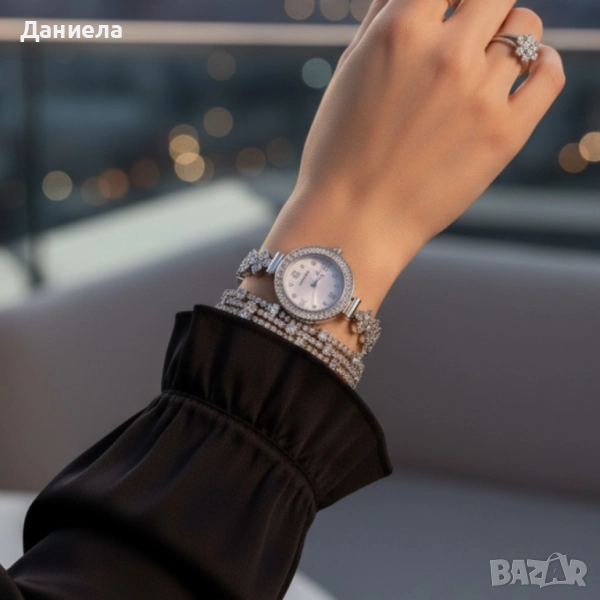 Дамски комплект часовник + гривна (подаръчен сет); Механизъм: Кварцов (Quartz) – надеждна ежедневна точност; Цвят: Сребрист; Циферблат: Перлен ефект; римски индекси на 12/3/6/9; маркери с кристали; тройка стрелки; Корпус и верижка: Метална сплав с бижутерско изпълнение и инкрустирани кристали; Стъкло: Прозрачно защитно; Гривна: дизайн според наличността; Поддръжка: Почиствайте с мека, суха кърпа; Подходящ за: Сватби, балове, празници, вечерни събития и елегантно ежедневие. Вариянт -с фини кристали в сребристо Вариянт-гривна с разноцветни кристали