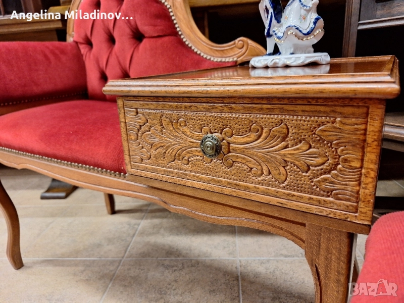 Винтидж телефонна пейка Луи XIV. Изключително красива телефонна пейка Луи XV череша масив, внос от Дания. Тапицирана с червен плюш с приятни извивки и нежна дърворезба. Чекмедже с месингова дръжка допълва винтидж стила. Отлично състояние. Разгледайте и другите ми обяви. Предлагаме и изгоден транспорт за цялата страна. Размери: Дължина - 100 см. Ширина - 44 см. Височина - 86 см. Цена - 390 лв.