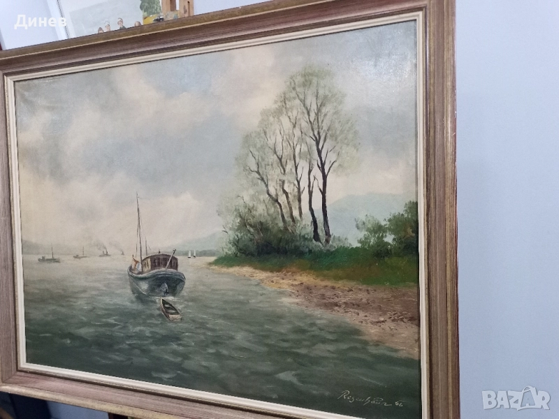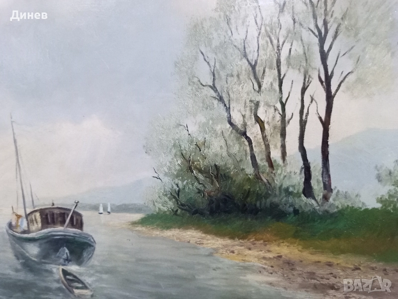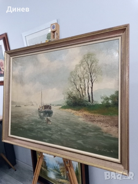Атмосферна маслена картина "Пейзаж с лодка" (Regehbar '86) - 68x88 см → Обява 51967072