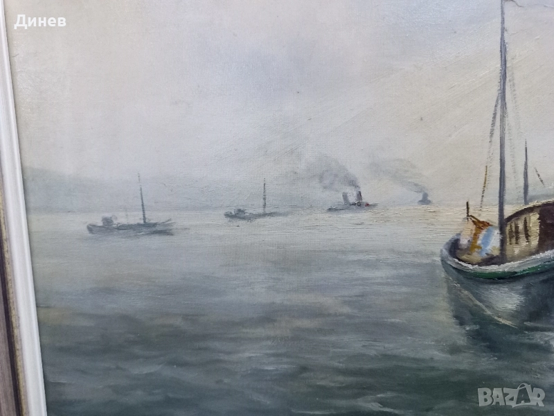 Продава се оригинална маслена картина върху платно в класическа рамка. ​Картината изобразява спокоен морски/речен пейзаж с рибарска лодка в центъра и далечни параходи, които ѝ придават носталгично и класическо излъчване. Цветовете са приглушени, сиво-зелени, създаващи много тиха атмосфера. ​Техника: Масло върху платно. ​Размери с рамката: 68 см х 88 см . ​Подпис: Regehbar '86. ​Състояние: Отлично, готова за окачване. ​Идеална за всеки, който цени морски пейзажи и класически стил в изкуството.