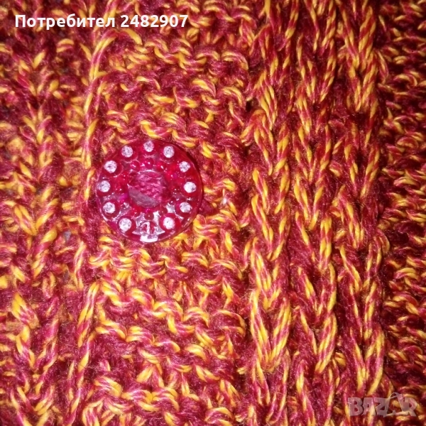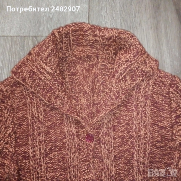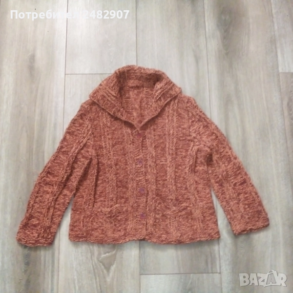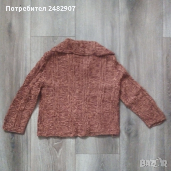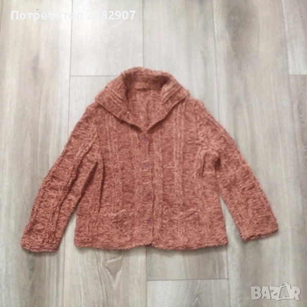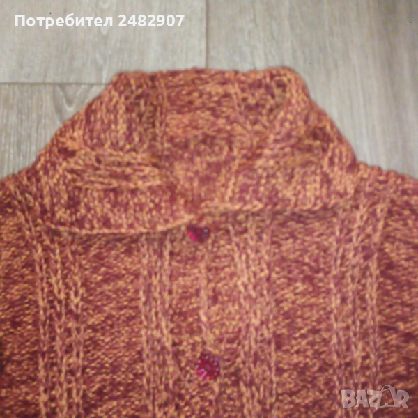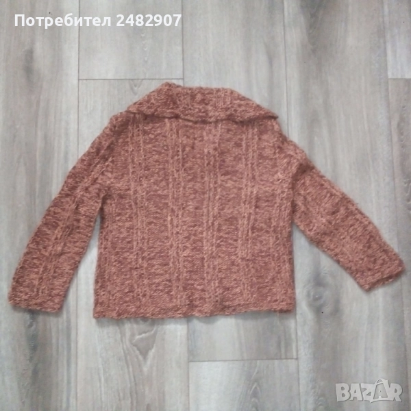Ръчно изплетена детска жилетка - ретро от времето на соца за възраст 4-5 години. Ширина в раменете - 30 см, ширина под мишниците - 39 см, ширина в долната част - 38 см, дължина от рамото до долу - 38 см, дължина на ръкава от рамото - 38 см, ширина на ръкава в долната част - 9 см. Много запазена, с два джоба, яка и 5 броя копчета отпред.