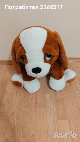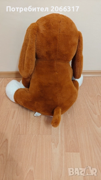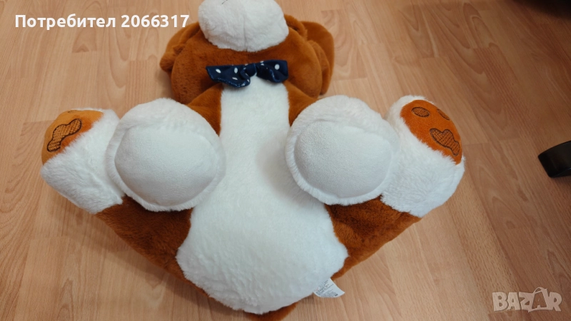 Меко и приятно на допир плюшено кученце, идеално за деца или за декорация. Опростен и приятелски дизайн със синя папийонка с точки и дискретни шевове на краката.
