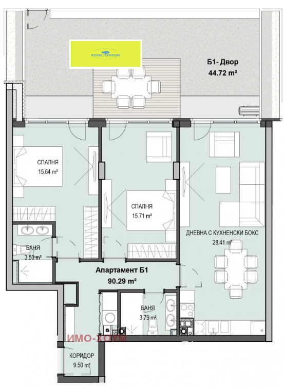 Разпределение: входно антре, просторна дневна с кухненски бокс от 29 кв.м., две големи спални от над 15 кв.м., две бани с тоалетна и балкон, собствен двор с големина 45 кв.м.