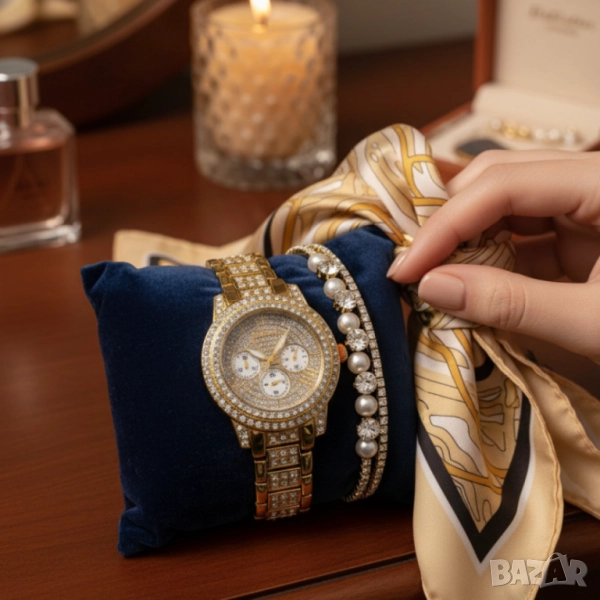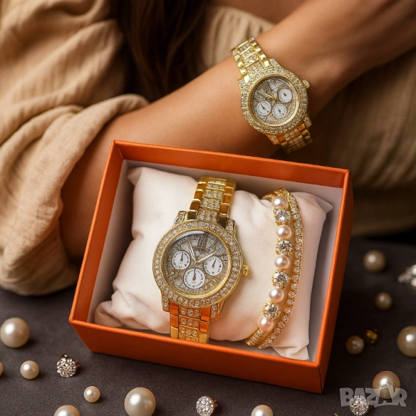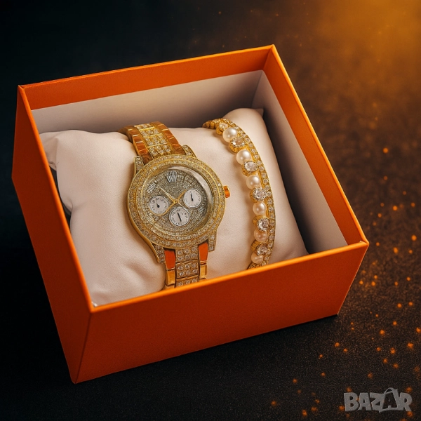Продукт: Дамски комплект часовник + гривна, златист, с кристали, в подаръчна кутия;