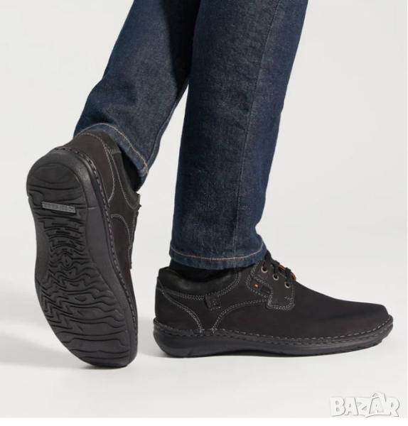 удобни мъжки обувки от естествена кожа - набук в черно; гъвкави, леки, амортизиращи подметки; подвижни, профилирани кожени стелки (могат да се заменят със собствени - ортопедични); ширина K - препоръчва се за широки стъпала.
