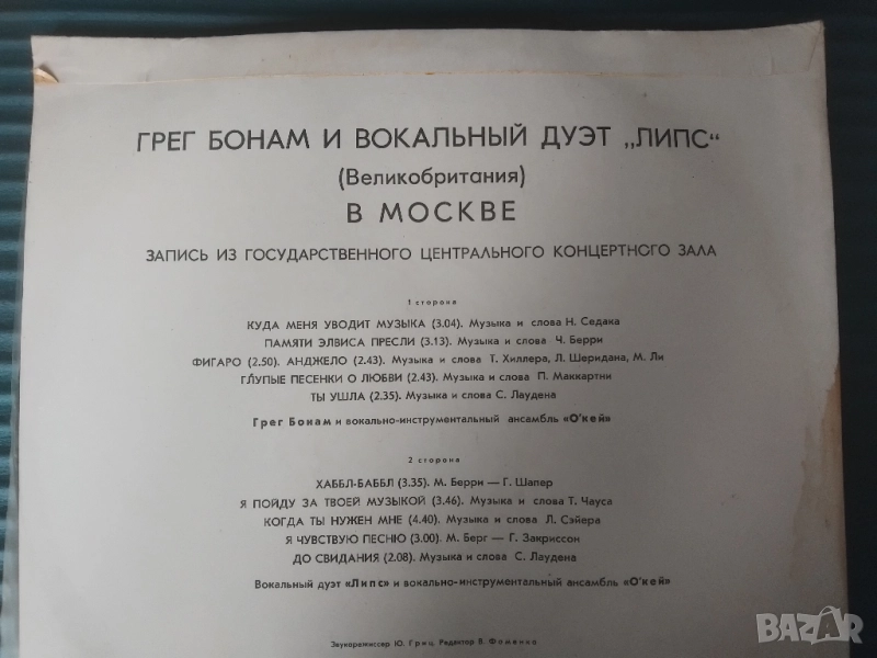Грег Бонам И Вокальный Дуэт «Липс» ‎– В Москве - грамофонна плоча музика, снимка 1 - Грамофонни плочи - 51969119 Грег Бонам И Вокальный Дуэт «Липс» ‎– В Москве - грамофонна плоча музика, снимка 2 - Грамофонни плочи - 51969119 1/2