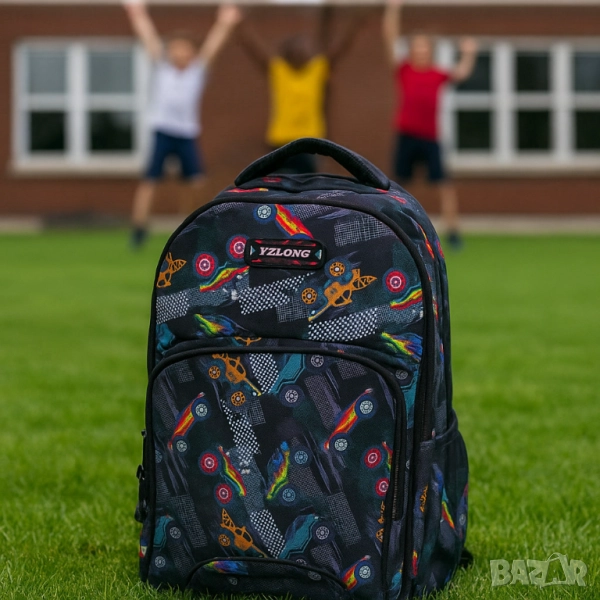 YZLONG – състезателни коли: Черен фон с пъстри изображения на състезателни коли, за деца с интерес към скоростта и моторните спортове;
