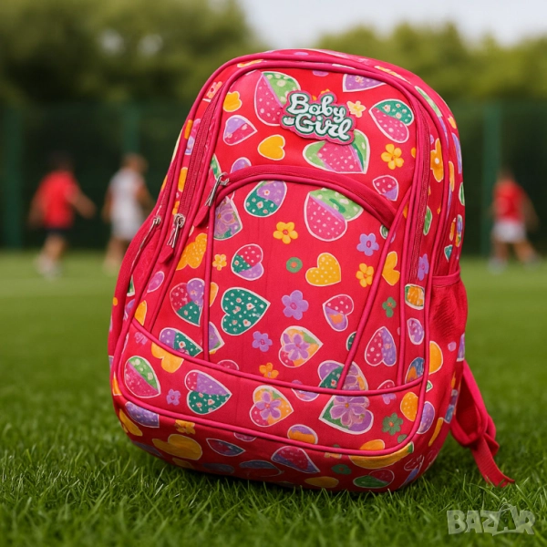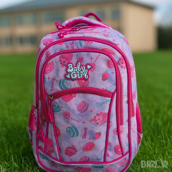 Baby Girl – сладки мотиви: Ярък розов дизайн с принтове на кексчета, макарони и ягоди, придаващ сладък и весел стил.;