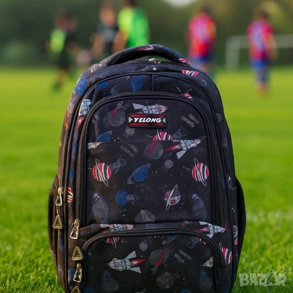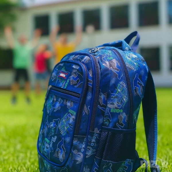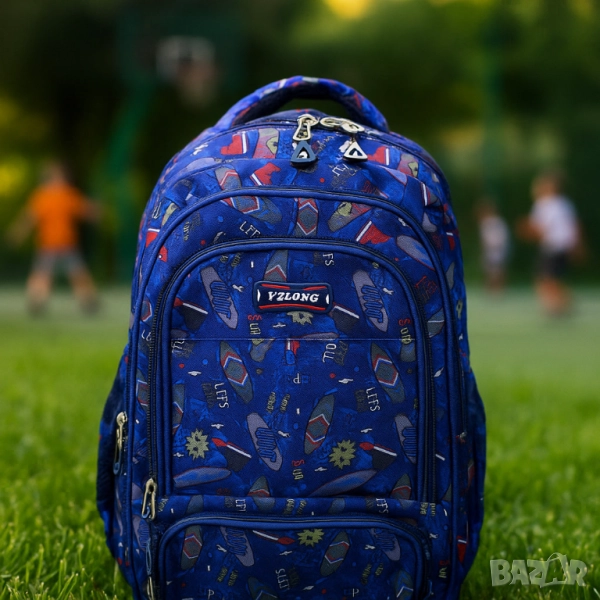 YZLONG – спортен стил: Синя раница с динамични графики на спортисти и надписи „Born to be free“, подходяща за активни момчета;