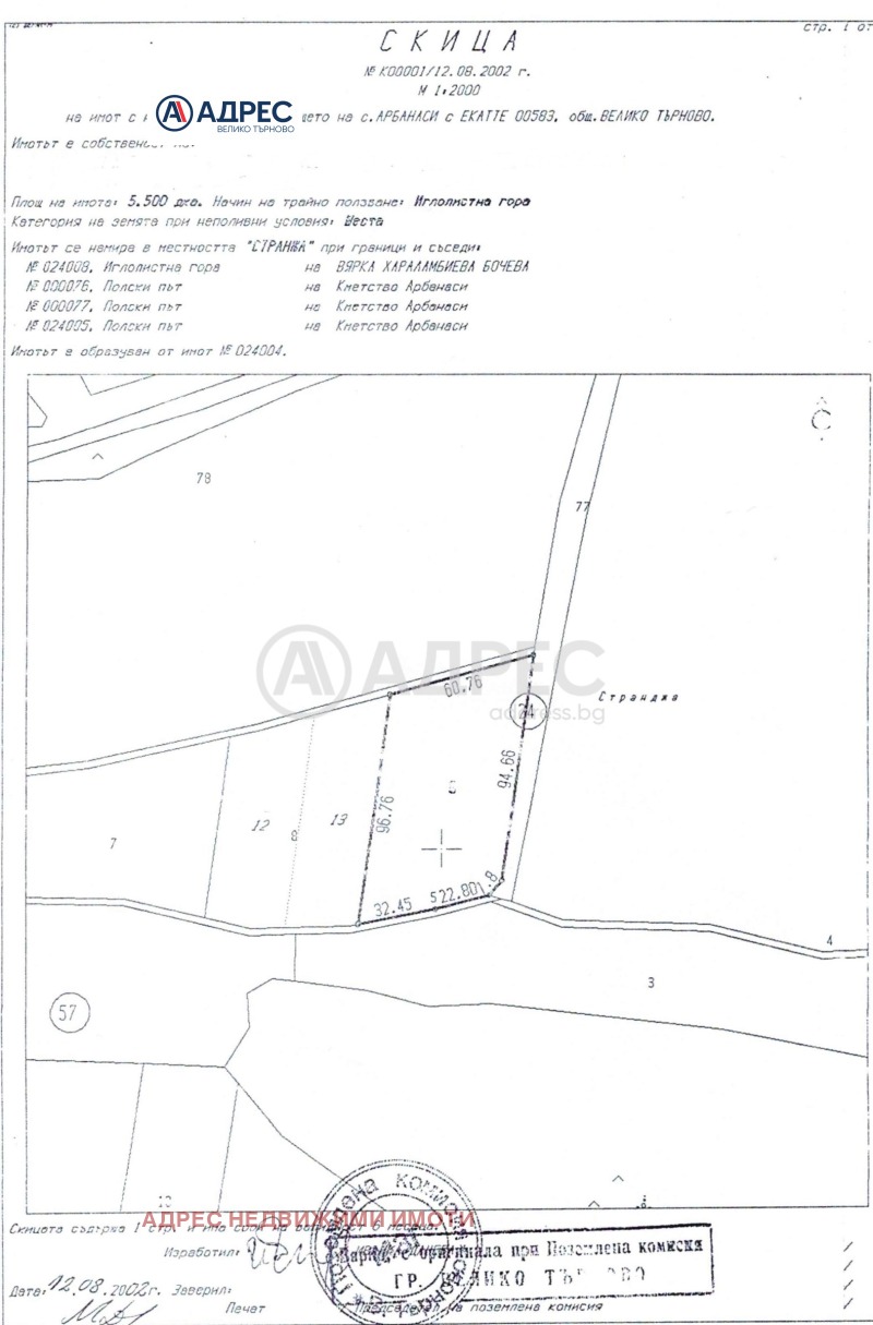 АДРЕС Недвижими имоти представя на Вашето внимание парцел с площ от 5500 кв.м. намиращ се в област Велико Търново, село Арбанаси в местността Странджата.