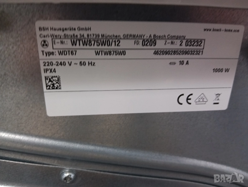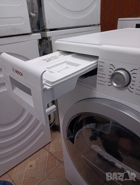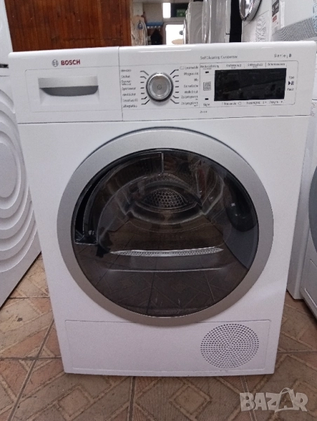 Най високият клас на Бош сушилня с термопомпа щадяща дрехите много икономична само 1000 вата с инверторен мотор, лед дисплей, отложен старт, изцяло тъчскрийн управление на бутоните, функция гладене за вадене на дрехите от сушилнята без гънки, само почистващ се кондензатор и др.