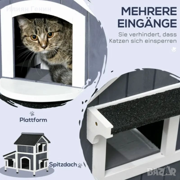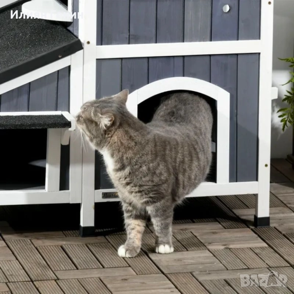 Външна къщичка за котки PawHut, двуетажна, естествено дърво, асфалтов покрив, сива, 96 x 65 x 85,5 см - 300.00лв.