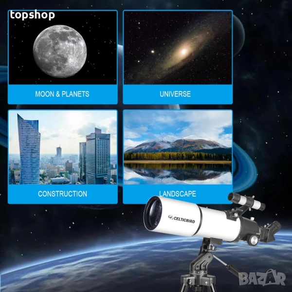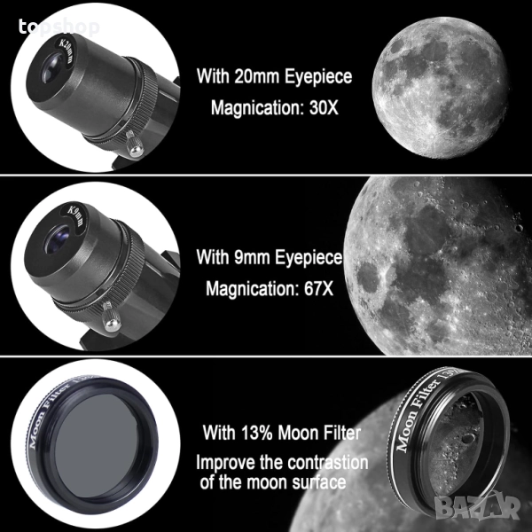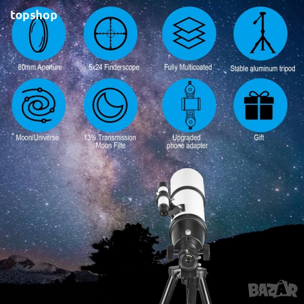 Телескоп с голямо увеличение апертура 80 мм, 600 мм, астрономия, AZ монтировка, раница, лунен филтър