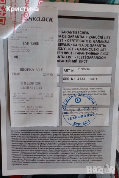 Закупена за 229.99лв на 30.12.2024 от Технополис. При покупка се изпраща с гаранцията.