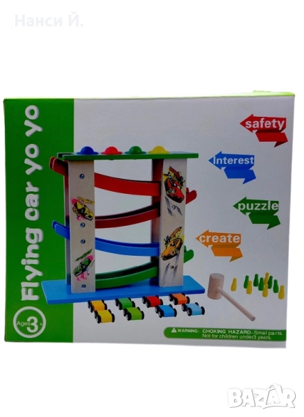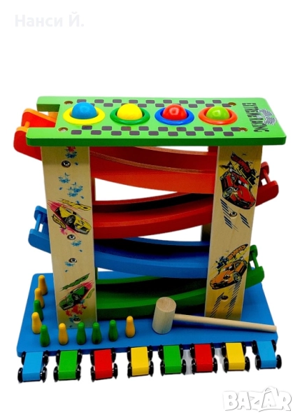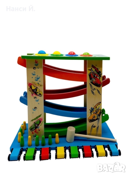 Дървена писта с колички и топки за спускане → Обява 51972262