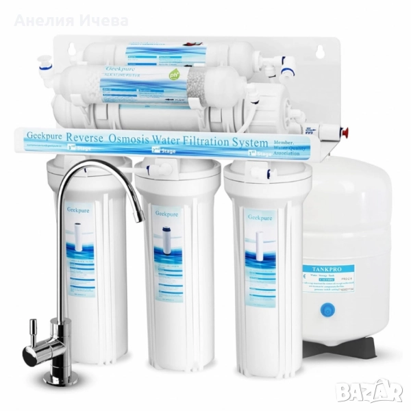 Метод: обратно-осмотично пречистване с пред- и постфилтрация Етапи на филтрация: 1) PP седимент (утайки/ръжда) – 6–12 м.; 2) GAC – гранулиран активен въглен (хлор/миризми) – 6–12 м.; 3) Carbon Block – 6–12 м.; 4) RO мембрана – намалява TDS; материално съответствие по NSF/ANSI 58 – 15–20 м.; 5) Post Carbon – 12–15 м.; 6) Алкален филтър – реминерализира и повишава pH – ~12 м. Размери на рамката (ориент.): вис. ~18.1", шир. ~14.2" Чучур (lead-free): височина 11.2", до чучура 6.5", издаден нос 6.1"; отвор за монтаж 1.5"; връзка 3/8"; комплект шайби: rubber, plastic, lock + гайка Включени фитинги: Feed Water Diverter Valve (адаптер 1/2" и 3/8"), Tank Ball Valve (3/8"), Drain Saddle (за тръба до Ø1.5"), бързи адаптери, цветни маркучи, клипсове, ключове за корпусите