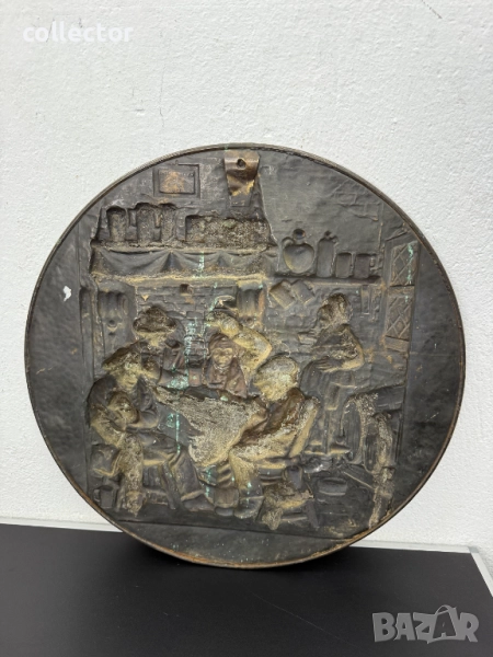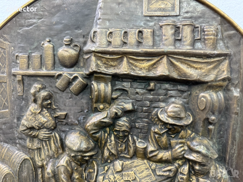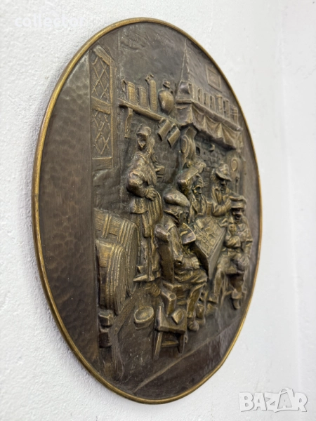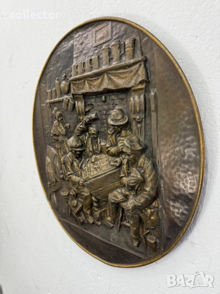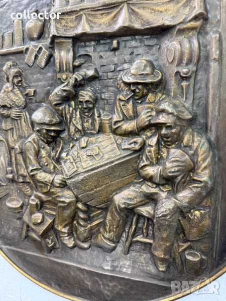Кръгал бронзов барелеф, изработен в Белгия. Наличи маркировки, изобразява кръчмарска сцена с играчи на карти.