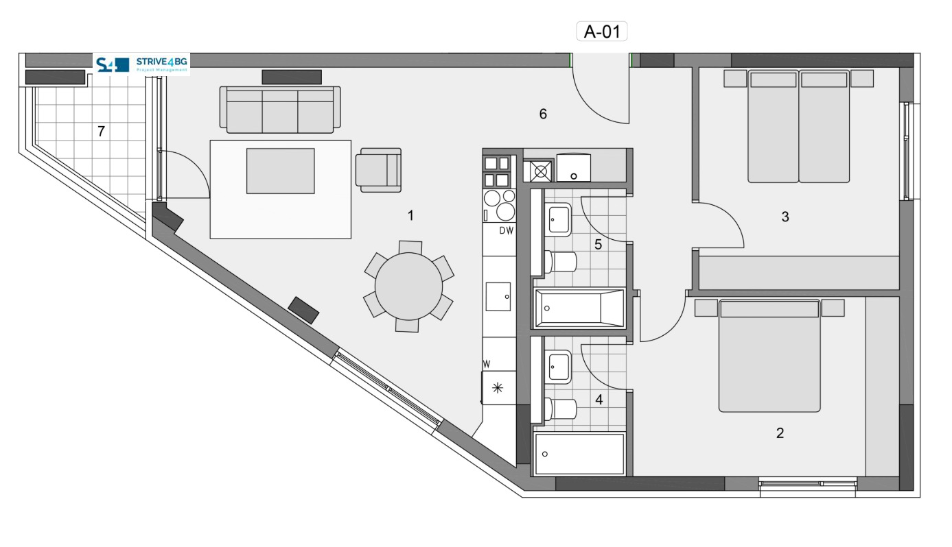 Разпределение: входно антре (9.10 м²), дневна с кухненски бокс и трапезария (29.56 м²), 2 спални (14.10 м² и 15.14 м²), 2 бани (4.25 м²), тераса (4.61 м²)