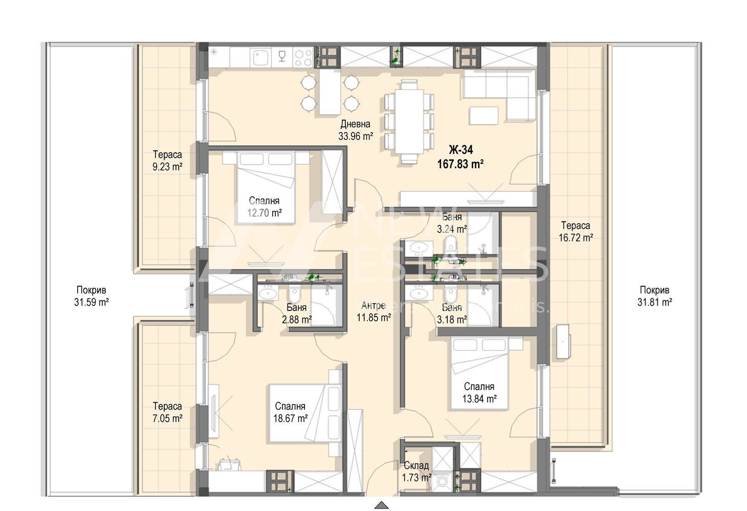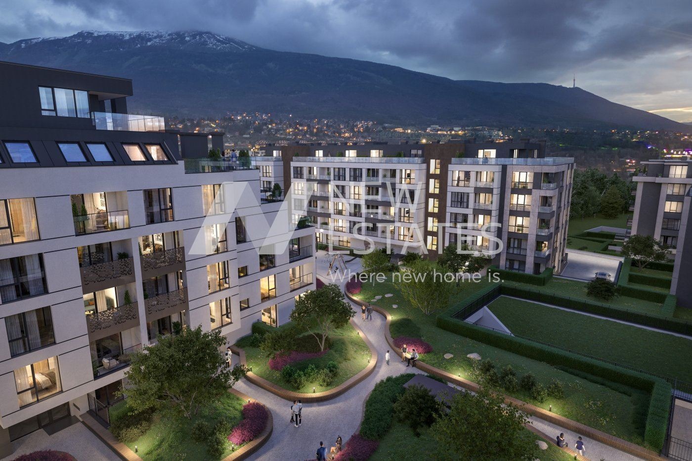 Представяме на Вашето внимание четиристаен апартамент в луксозна, функционална и екологична жилищна сграда, ситуирана в Южната част на град София. Локацията е изключително комуникативна с осигурен бърз достъп, както до административната част на града, така и до редица културни, спортни и обществени зони. Комплексът е хармонично вписан между парк Витоша и градската среда на столицата. Поддръжката ще се осигурява от професионална компания, отговаряща за цялостния процес по почистване на общи части и фоайета, асансьори, озеленяване и аранжиране на парковата среда, сметоизвозване и снегопочистване. Сигурност - физическа охрана и видеонаблюдение. Ще бъде изградена съвременна и модерна детска площадка в безопасна среда без автомобили. Открит екстериорен фитнес в комплекса- мултифункционална станция, която ще предлага изключително разнообразие от упражнения. Паркирането е решено на две нива- подземно и полуподземно ниво, като има възможност за избор на единични или двойни гаражи и паркоместа.