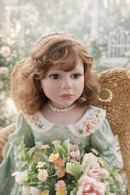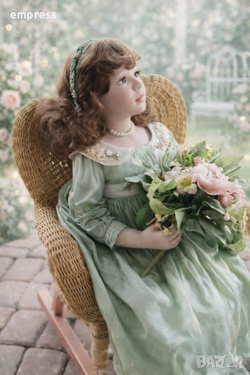 Beth е от онези кукли, които сякаш носят собствено настроение – тиха, мечтателна и много нежна. Погледът ѝ е спокоен, а изражението ѝ напомня за стара приказка, разказана в градина, изпълнена със светлина и цветя. Нейната рокля в мек зелен нюанс пада леко и ефирно, а фините детайли по яката и ръкавите ѝ придават изящество и винтидж очарование. В ръцете си държи букет, който допълва усещането за пролет и свежест, а всичко в образа ѝ излъчва мекота и хармония.