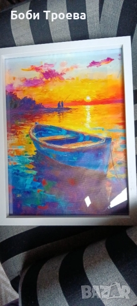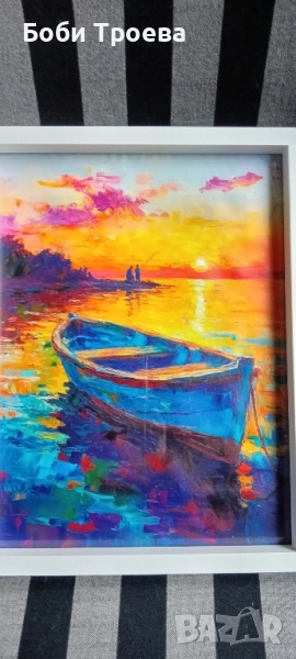 Средиземноморски крайбрежен пейзаж с лодка,синьо море,залез → Обява 51974449