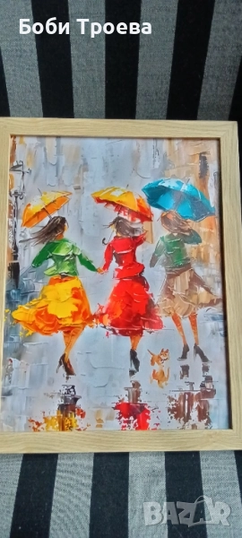 Ярки момичета с чадъри в дъждовен ден, 30 см.x 40 см Вертикална стенна декорация → Обява 51974843