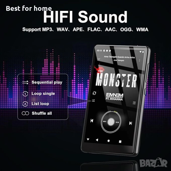 Kindle, YouTube, FM радио и други. Съвместим е с повечето музикални формати MP3, WAV, APE, FLAC, AAC, OGG, WMA и други. И предлага различни категории песни, като заглавие, папка, изпълнител, албум.