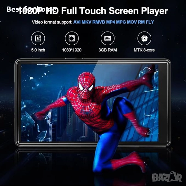 Превъзходно визуално изживяване --- 5-инчовият IPS сензорен екран осигурява ярко визуално изживяване. С резолюция 1080P HD, всеки детайл от любимите ви филми, видеоклипове и снимки ще бъде реалистичен и ясен. Поддържа видео формати AVI, MKV, RMVB, MP4, MPG, MOV, FLV, RM и др., няма нужда от конвертиране за директно възпроизвеждане.