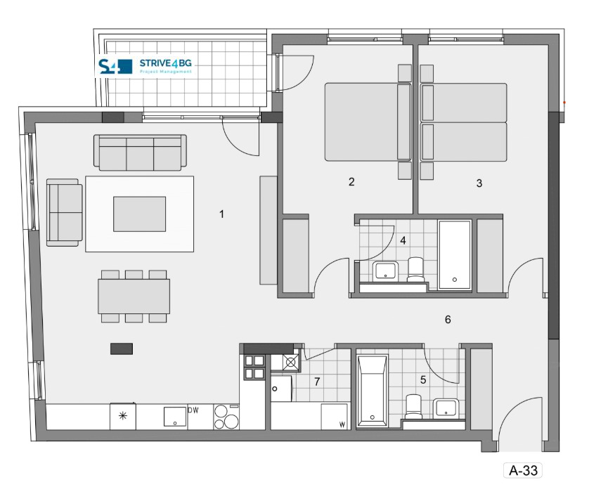 Разпределение: входно антре (10.45 м²), дневна с кухненски бокс и трапезария (38.20 м²), две спални (14,72 м² и 14,74 м²), две бани (4,76 m2 и 4,42 m2), тераса (7.16 м²), килер (3.43 м²)
