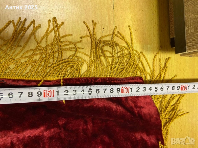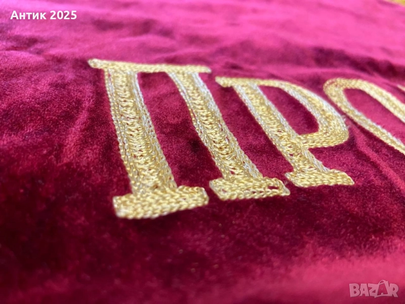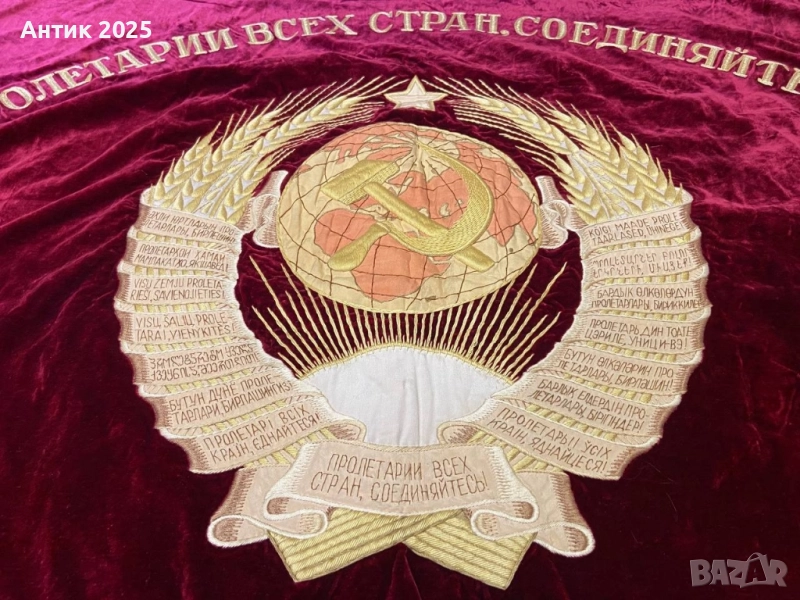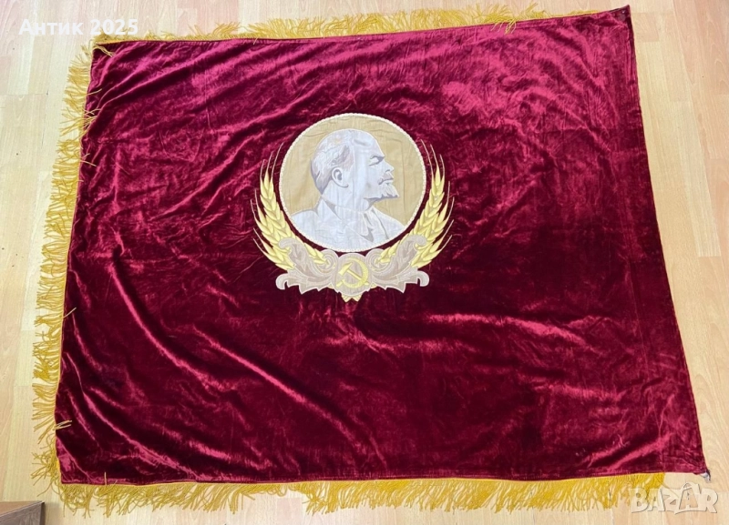 знаме от времето на СССР, изработено от плътно бордо кадифе с ръчна бродерия с жълти текстилни конци. От едната страна е изобразен профилът на В. И. Ленин, а от другата – държавният герб на СССР и надписът „ПРОЛЕТАРИИ ОТ ВСИЧКИ СТРАНИ, СЪЕДИНЯВАЙТЕ СЕ!“. По краищата има декоративен жълт кант с пискюли. Знамето е в много добро състояние – без липси и сериозни повреди, платът е плътен, бродерията е обемна и качествена. Прекрасен експонат за колекция на съветска символика, музей, интериорно оформление или фотосесии. Приблизителни размери: 160*130 Материал: кадифе, бродерия с жълти текстилни конци