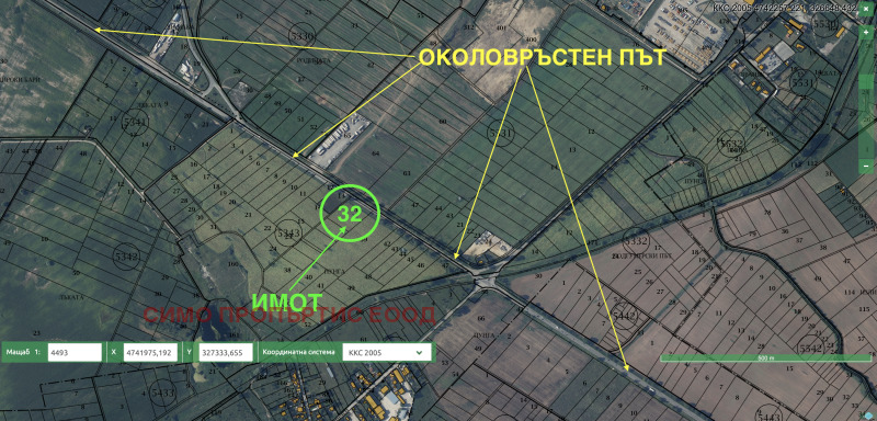 Сегашната квадратура на имотът е 4500 кв.м.. В бъдеще има проект за разширяване на околовръстния път в севрната му час. Според градоустройствения план от тази квадратура ще бъде отнета площ около 1800 кв.м.. Лицето на имота и след отнемането на тази площ ще остане 61 метра и отново ще граничи с околоврътсня път. Предимство за новия собстеник ще бъде, че ще бъде обезщетен на пазарни цени от общината за квадратурата, която ще му се отнеме от имота му за разширвяането на пътя. Формата на имота е правилна и ще остане такава. Градоустройствената зона в която попада имотът е Смф 2, с възможни показатели на застрояване: