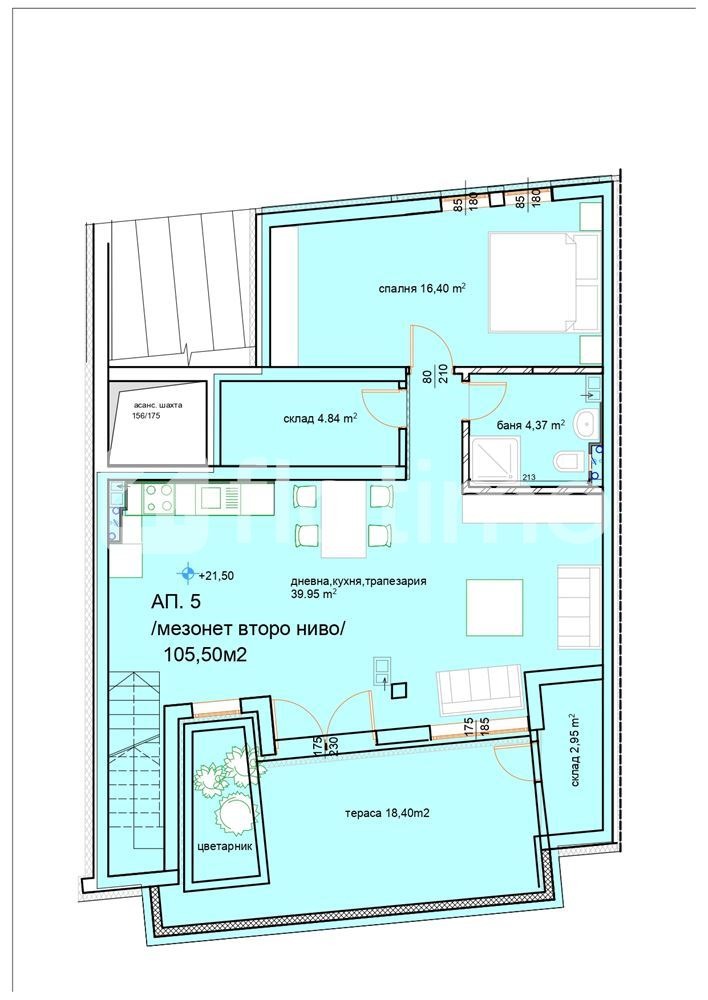 Ниво 2: Една спалня, просторна дневна с кухненски тракт (40 кв.м.), голяма тераса с цветарник ( 19 кв.м. ), две складкови помещения и един санитарен възел