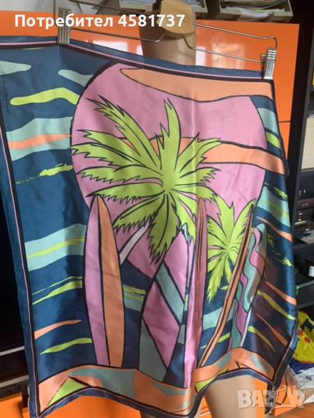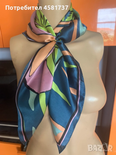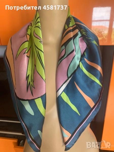 Много свеж аксесоар, с живи, наситени цветове, изработен от естествена и много ефектна материя-коприна. Невероятно гладък и лъскав. Шалът е малък. Подходящ е както за стандартното си приложение на шията, така и като кърпа за глава.