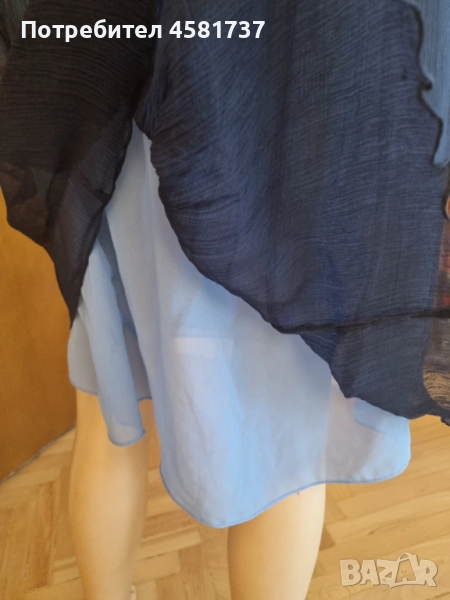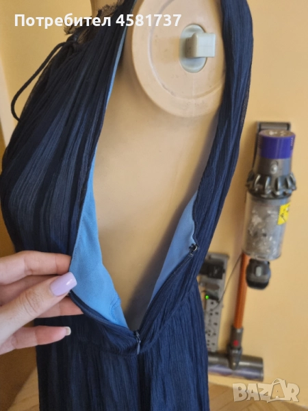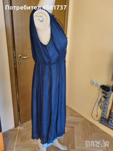 Много красива рокля на италианския бранд Stefanel в наситен тъмносин цвят(" navy"). силен акцент и контраст е светлосинята подплата, която следва роклята по цялата й дължина като красиво се подава и под нея. Роклята е с красив набор в областта на талията, а цялата материя стои леко намачкано, а не гладко като типичната