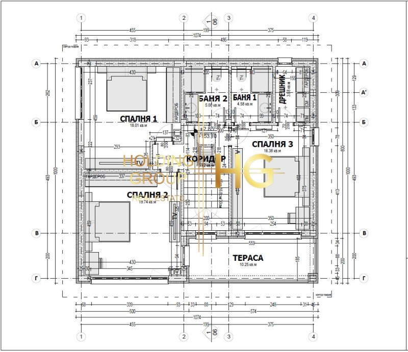 Втори етаж: централен коридор, спалня 1 със собствена баня и дрешник, спалня 2 с отделна баня с тоалетна, перално помещение.