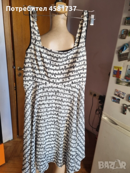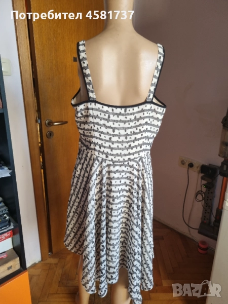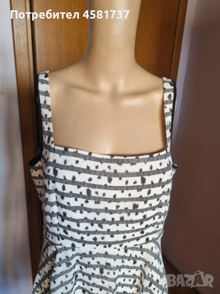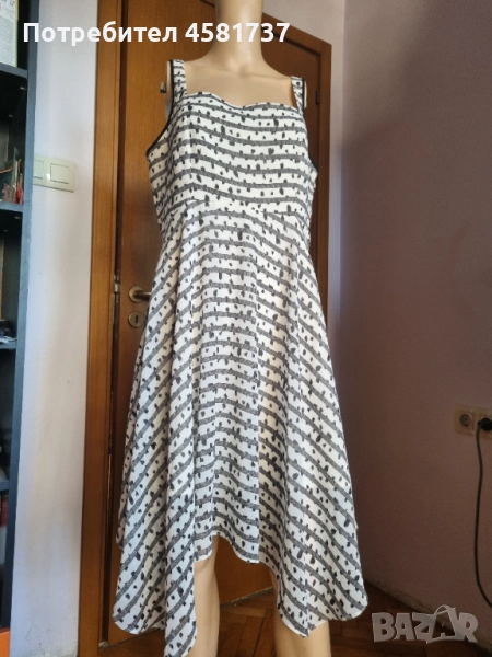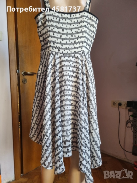 Exchange. Много женствена и феерична кройка. С презрамки, подчертаващи изящността на раменете, обкантени с черно като акцент. Вталена в горната си част и разширяваща се надолу. Роклята в завъшващата си част пада асиметрично, което придава много интересен, закачлив и кокетен вид с нестандартното решение на кройката. С подплата. Със станичен цип. Много красива!