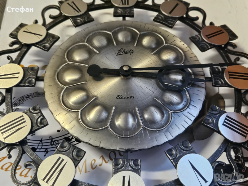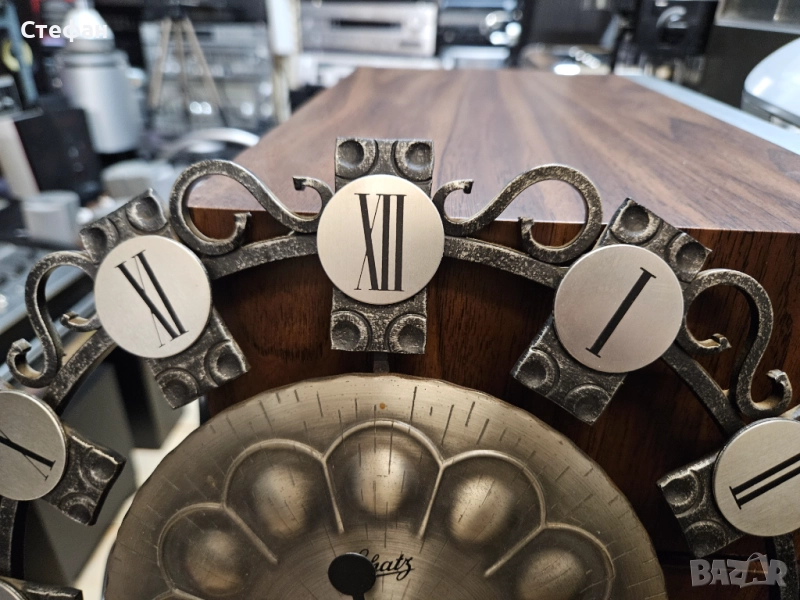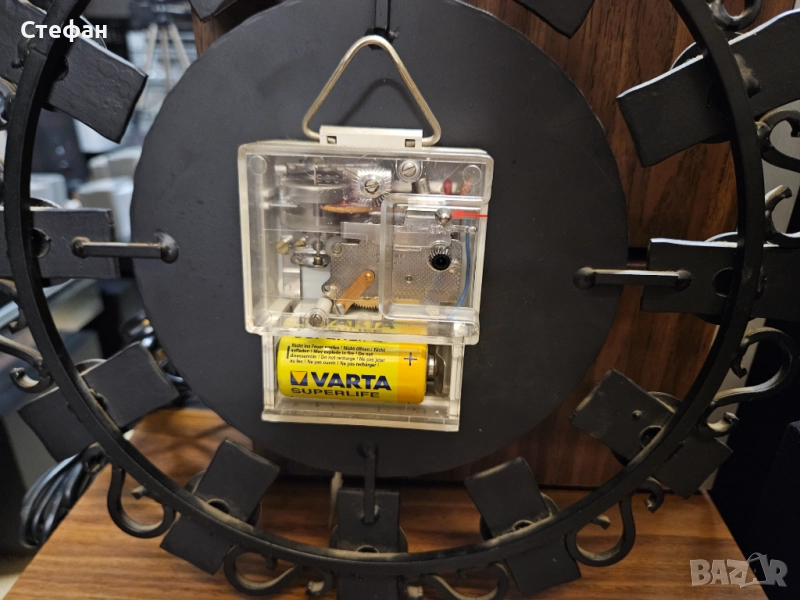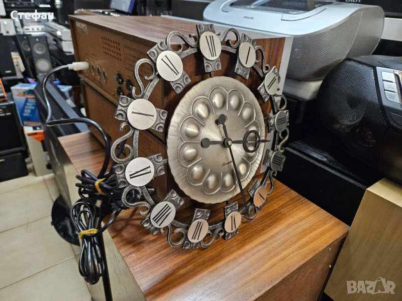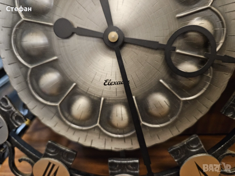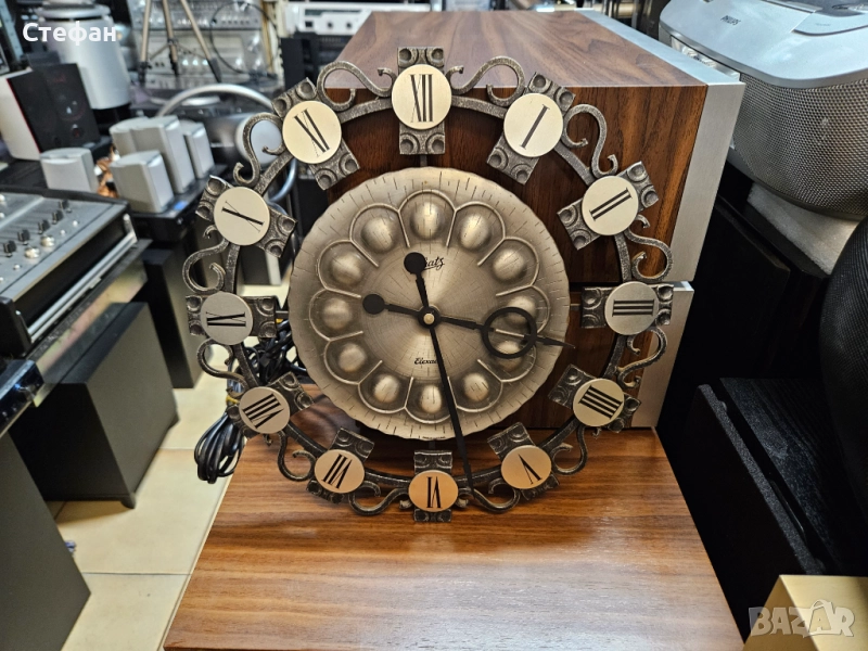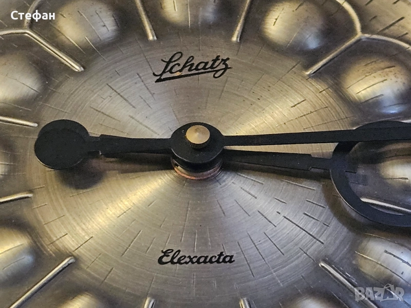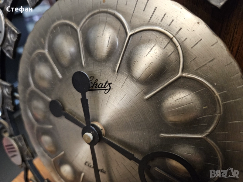 Винтидж стенен часовник със звездовиден дизайн от средата на века, стенен часовник MCM със сребърни слънчеви лъчи, стенен часовник Schatz Elexact от ковано желязо от средата на века, емблематичен стенен часовник Wanduhr