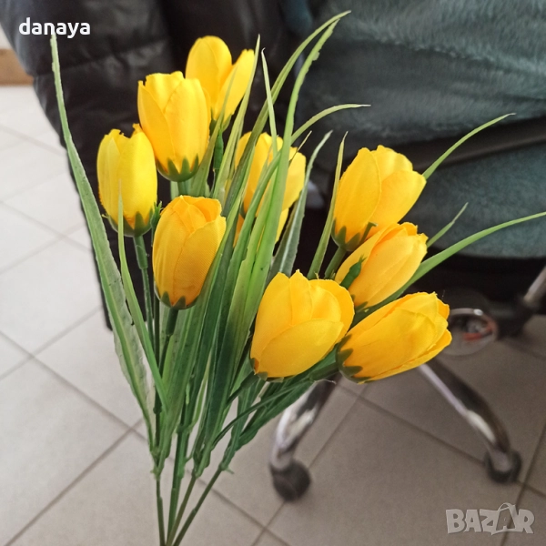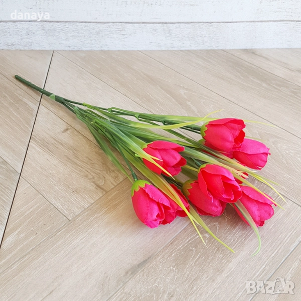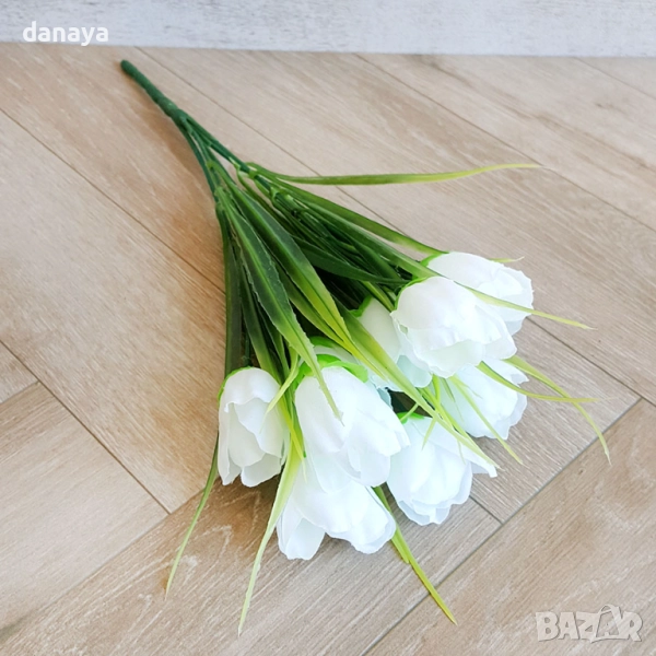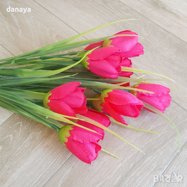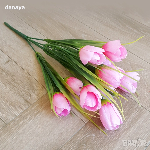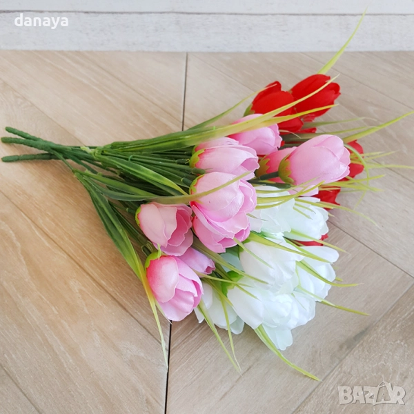 Изкуствени лалета в букет. Красиви букети изкуствени лаленца, ефектни, пролетни и цветни! Декоративни бели лалета, розови лалета, лилави или червени лалета по 10 броя събрани в букет. Изкуствени цветя за декорация у дома или офиса. Височината им е 30см. Изработени от пвц и текстил.