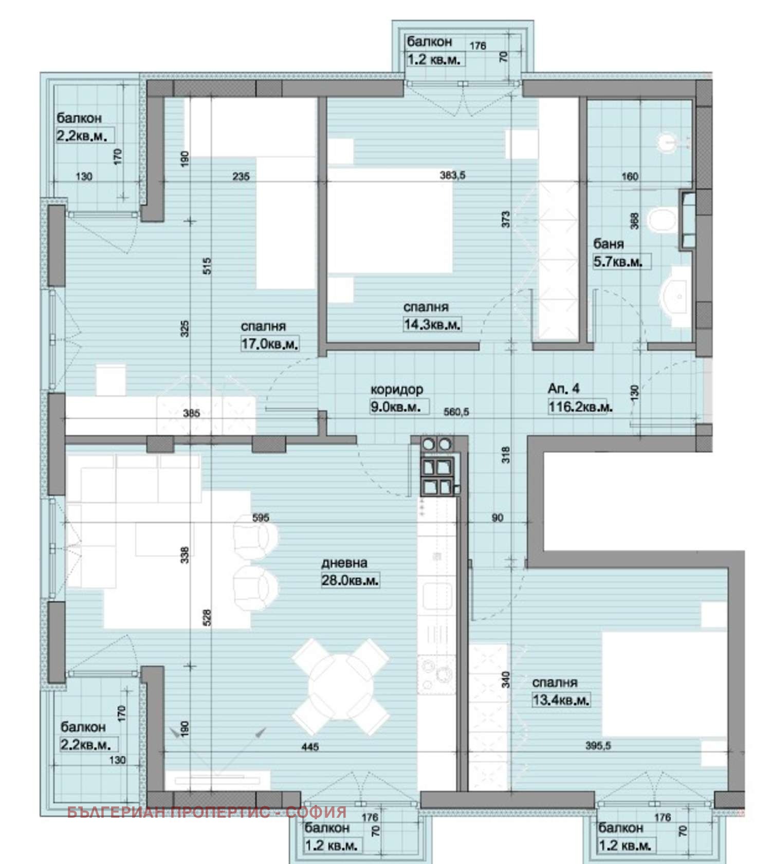Апартамент 4 , обща площ 132.54 кв.м. (нетна площ 116.20 кв.м. + общи части 16.34 кв.м.).