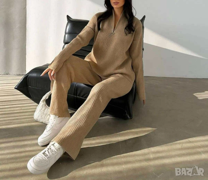Комплект от две части Машинно плетиво с поло яка Деликатно декориран с камъни ( модела на снимката е без камъни, но я качвам, за да се придобие представа как стои) Универсален размер 65лв