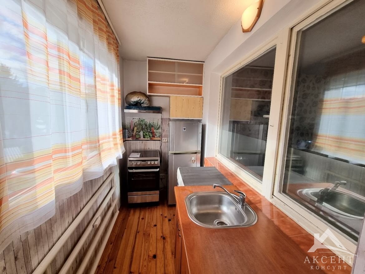 🍽️кухня-изложение запад. Подът е с дървено душеме, а стените с латексова боя. Обзаведена с кухненски шкафове, печка, пералня и хладилник;
