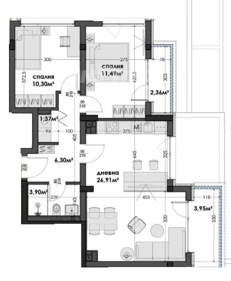 Представяме ви прекрасен тристаен апартамент със слънчева всекидневна 27 м2, с излаз на тераса 4 м2; родителска спалня със самостоятелна тераса; втора спалня.; баня с тоалетна в едно; мокро помещение.