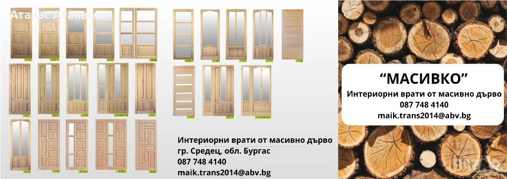 Продавам врати от масив ,различни размери и модели. Към тях предлагаме и каси както и первази. Възможна е безплатна доставка при покупка над 3 бр.