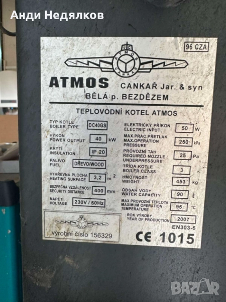 Продавам водогреен пиролизен котел ATMOS DC40GS (дърва), 40 kW. Котелът е ползван, напълно работещ, демонтиран и готов за товарене. Подходящ за по-големи къщи/сгради.Модел: DC40GS