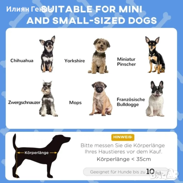 ✔ За мини и малки кучета с дължина под 35 см и тегло под 10 кг