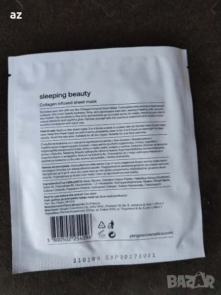 yenges спяща красавица Лист-маска с колаген Намалява фините линии Стимулира клетъчното обновяване Повишава хидратацията За по-сияйна и по-млада кожа Подходяща за всички типове кожа.