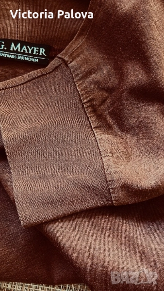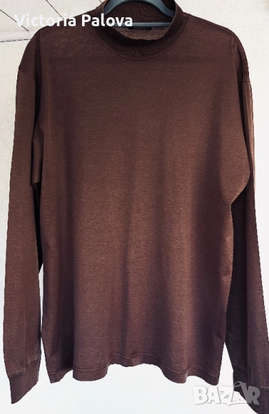 Висок клас фин трикотаж, двойно мерсеризиран памук с повишен мек блясък, висока здравина и гладкост, подходящ за ежедневен елегантен стил, офис, слоеве под сако. Марката е известна със своята прецизна изработка и класическа визия с луксозно усещане. Рамо - 56см, ГО - 60см, дължина - 73см, ръкав - 65см.