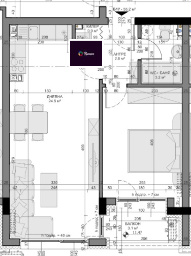 Разпределението е функционално, помещенията са светли, с правилни форми, което улеснява проектирането и реализирането на интериорните решения.