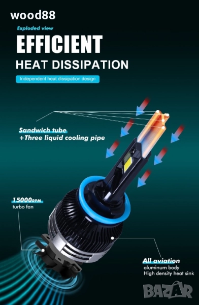 Интегрирана конструкция с вакуумна медна тръба за по-ефективно охлаждане. Вакуумния меден компонент (топлинна тръба) охлажда 200 пъти по-ефективно от стандартния меден профил ,който се използва при стандартните лед крушки за коли.